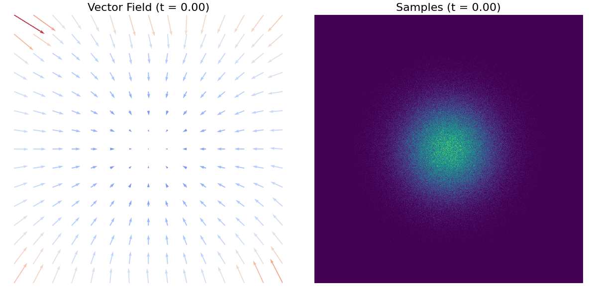 아래 gif는 단일 가우시안 분포를 체커보드 분포로 매핑하는 과정을 벡터 필드와 함께 시각화한 것입니다.